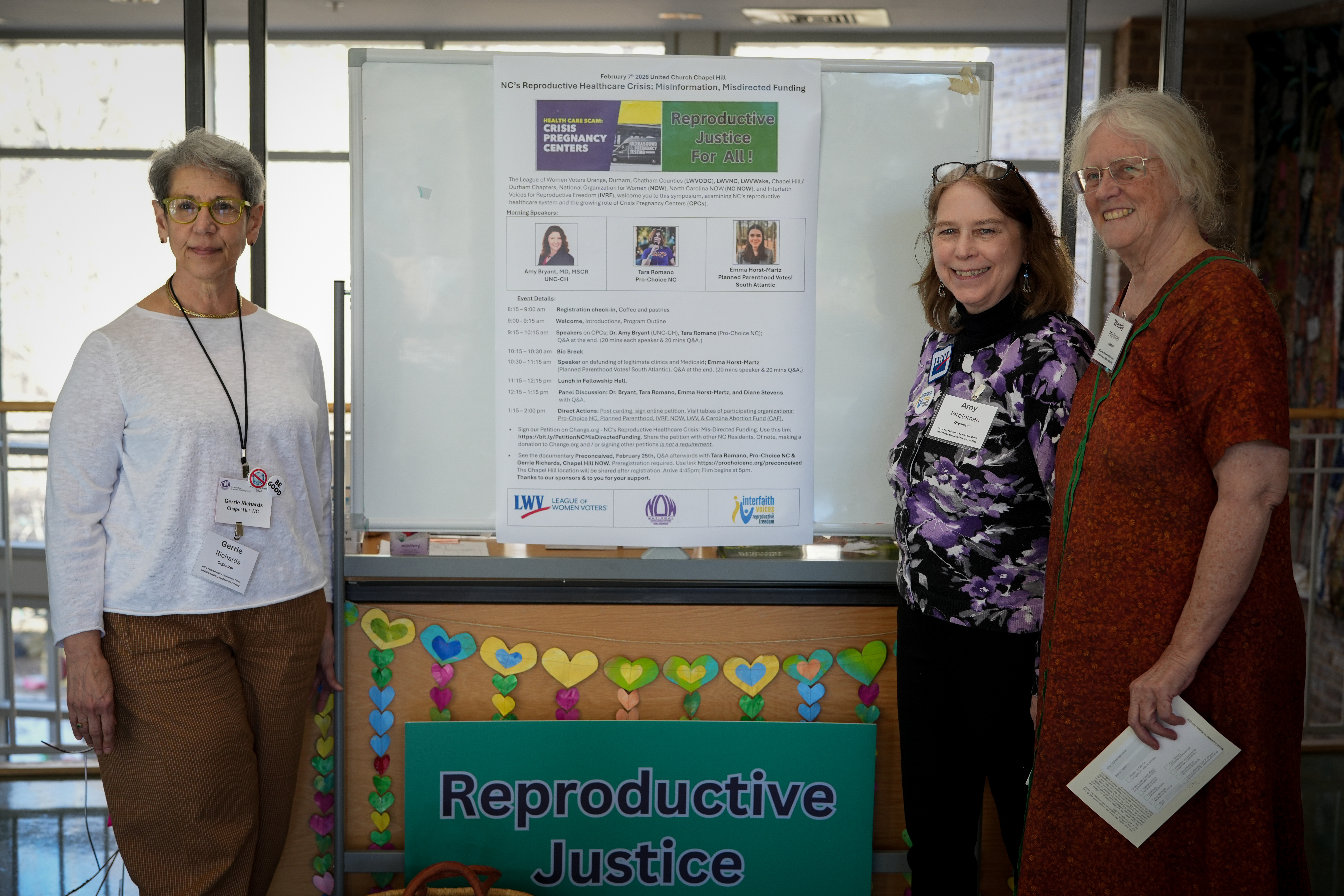 People kept coming into the fellowship hall, some clearly finding friends and others standing around, coffee cups in hand waiting for introductions. The tone of the voices in the room were overall hopeful, at times anxious or angry, but all willing and eager to speak to others. We were gathering after being called and organized by several different groups, starting with Chapel Hill NOW, and the local chapter of the League of Women Voters. The other partners in the room included Pro-Choice NC, Planned Parenthood of the South Atlantic, Carolina Abortion Fund, Triangle DSA, and of course ourselves at Interfaith Voices for Reproductive Freedom.
